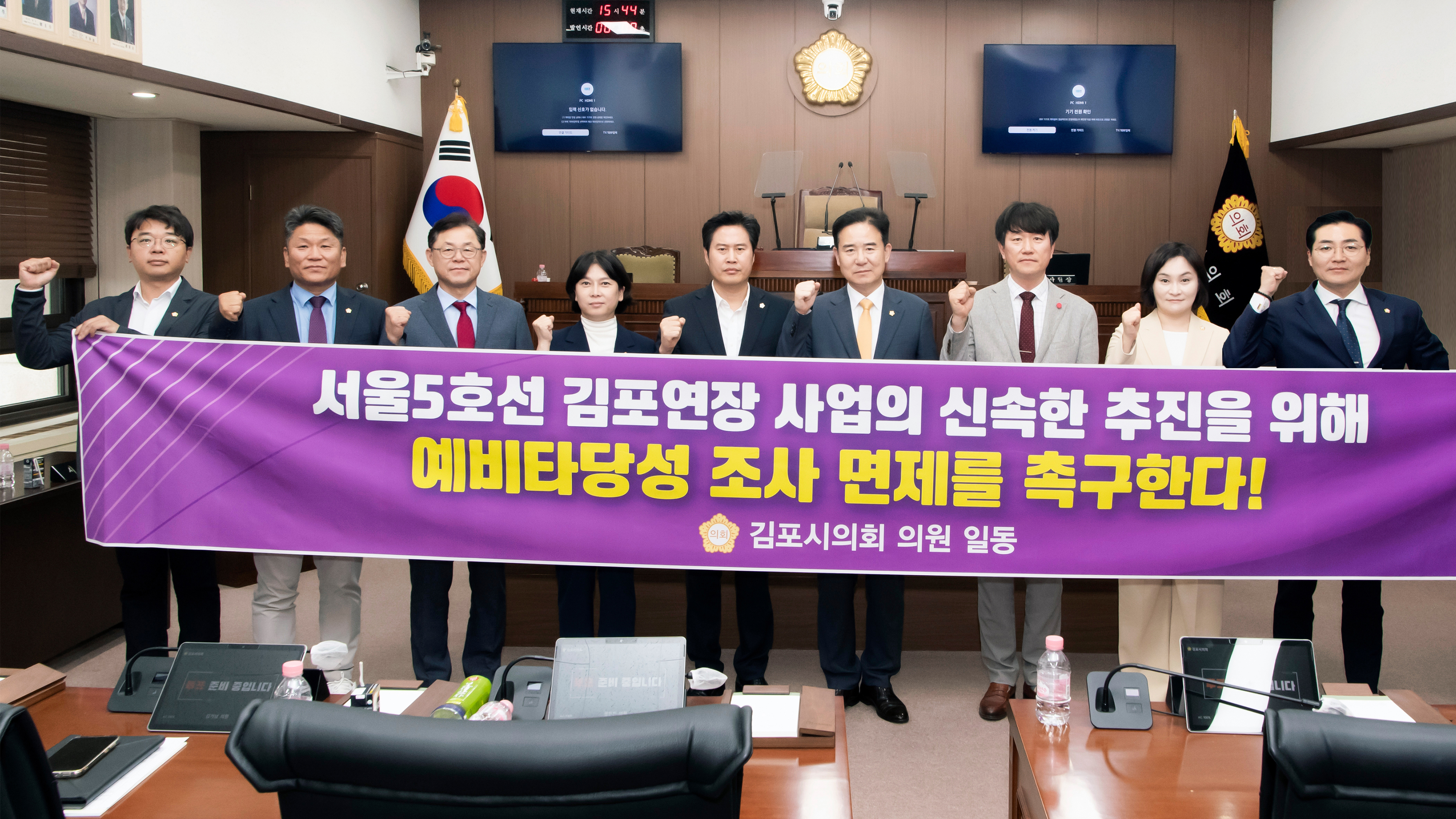 (김포시의원들이‘서울5호선 김포 연장사업 예타 면제’를 촉구하고 있다.)