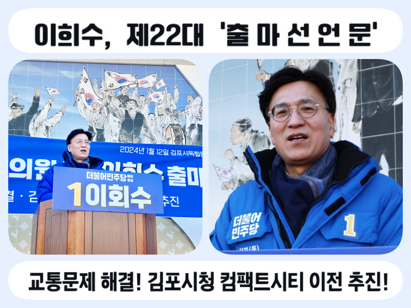출 마 선 언 문 정치혁신과 인물교체로 민주당의 승리를 이끌고 김포문제를 해결해내겠습니다. -교통문제 해결! 김포시청 컴팩트시티 이전 추진!- 안녕하십니까? 제22대 국회의원선거에서 경기 김포시을 선거구에 출마하는 더불어민주당 예비후보자 이회수입니다. 제가 이번 22대 총선 김포을 선거에 출마한 이유는 세 가지입니다. 첫째, 저는 김포 최대 현안인 교통 문제를 해결하고자 합니다. 5호선 직결 실패 시 불출마 등 국민의 힘 홍철호 후보의 실언과 김포시장의 협상력 부재가 큰 문제이지만 교통 문제를 포함하여 김포 민주당은 그동안 속 시원한 성과를 내지 못했습니다. 문제를 제대로 해결하는 실력 있는 김포 민주당이 되기 위해서도 우리 지역에서도 정치혁신과 인물교체가 필요합니다. 둘째, 저는 김포의 발전과 김포시민의 이익을 진정으로 대변하고자 합니다. 그간 김포시와 국민의 힘은 경기도가 승인한 “2035 김포도시기본계획”이나 김포의 비전과 미래에 관한 모든 것을 내팽개치고 오로지 선거용 행정 개편론만 추진해왔습니다. 김포의 지역균형발전과 서부수도권의 광역적 경제발전이 더 중요합니다. 저는 서부수도권의 중심도시로 성장할 수 있는 김포의 발전을 위해 뛰겠습니다. 셋째, 저는 지역통합의 리더십을 발휘하고자 합니다. 김포시는 지난 7월, 여론조사기관 리서치뷰에서 발표한 김병수 김포시장의 시정 지지율이 30%대 초반으로 추락하자 이를 만회하려 꼼수를 썼습니다. 시민 통합을 해야 할 행정이 시민 갈등의 당파정치를 획책한 것입니다. 저는 분열주의적 김포시정을 확실히 견제하고 이를 바로잡고자 합니다. 사랑하는 김포시민 여러분! 김포을 지역 시민여러분! 지금 대한민국은 백척간두에 서 있습니다. 1) 이제 한반도는 한 발짝만 잘못 내디디면 우크라이나 전쟁이나 이스라엘 내전처럼 언제 전쟁이 일어날지도 모르는 위태로운 나라가 됐습니다. 균형외교와 실리외교를 포기한 윤석열 정부의 미일 편중외교와 상대를 악마화하는 적대적 이념정치가 문제의 근원입니다. 군사적 긴장 고조뿐만 아니라 최대 교역국인 중국으로의 수출격감으로 인해 경제의 피해도 대단합니다. 특히 김포는 서부수도권의 관문이자 남북 접경지역으로서 그 피해가 더 심각합니다. 평화경제특구와 한강하구의 지속가능 개발 등 김포미래발전을 위한 계획들을 실현하기 어려워졌습니다. 2) “자고 나니 선진국이었던 나라”가 불과 1년도 안 되어 “자고 나니 다시 후진국이 되었다.”는 말이 더 이상 우스갯소리가 아닌 현실이 되어버렸습니다. 나라 경제가 뒷걸음치고 지역경제가 완전히 무너졌습니다. 끝도 모를 경기침체로 민생경제와 서민경제가 망가지고 있습니다. 고금리, 고물가로 자영업자들과 소상공인들은 가계부채에 시달리며 집단적인 우울증까지 겪으면서 소외된 사람들이 소리 없이 죽어가고 있습니다. 3) 대한민국 헌법은 3권 분립에 기반한 민주적 통치를 규정하고 있습니다. 그러나 윤석열 검찰 독재정권은 국회에서 통과된 양곡관리법과 간호법은 물론 이고, 최근에는 ‘김건희 특검’과 ‘대장동 50억 클럽 특검’ 등 쌍특검까지 거부권을 행사하면서 “국민 누구에나 공정한 법집행”이라는 대원칙을 무너뜨렸습니다. 또한 강제징용의 문제나 야간집회의 자유 등 법원의 결정조차 무시하고 있습니다. 한마디로 삼권분립과 민주주의가 무너져내렸습니다. 윤석열 대통령은 헌법을 수호해야 하는 대통령의 의무를 저버리고, 박근혜 대통령의 국정농단보다 훨씬 심한 헌법위반을 하고 있습니다. 4) 지금 민주당이 추구할 시대정신은 무엇입니까? 대통령을 탄핵하고 새로운 나라를 꿈꾸었던 온 국민의 촛불정신을 되살리고 지난 시절의 개혁실패의 원인들을 냉정하게 성찰해봐야 합니다. 다시 민주당을 혁신하고 정치교체와 국민통합의 정치를 추진해야 합니다. 더 이상 윤석열 정부와 국민의 힘의 실정에 기대어 반사이익을 얻고자 한다면 이번 총선에서 이길 수 없습니다. 5) 이를 위해서는 더불어민주당의 세력교체와 인물교체가 필요합니다. 저는 국회에 가면 민주당의 변화와 혁신의 정치를 주도하겠습니다. 시민이 열망하는 새로운 세상으로 나아가기 위해서는 이재명 대표와 함께하는 새로운 혁신세력과 신진 정치세력들이 총선승리의 선봉에 나서야 합니다. 총선을 앞두고 지난해 가을 경기도와 김포지역에서 나타난 인물교체에 대한 여론지수는 재선 지지율이 20%대 초중반에 머무르고 인물교체 지수도 두 배에 달하는 40%대 중반을 넘어서서 정치교체에 대한 시민들의 열망이 높은 상황입니다. 이번 총선은 “정치교체, 세력교체로 대한민국과 김포가 다시 역동적으로 살아날 것인가? 아니면 여야 기득권 정치 연장으로 제2의 IMF와 같은 대위기로 빠져들 것인가?”를 판가름하는 중요한 선거입니다. 사랑하는 김포시민 여러분! 그리고 김포한강신도시와 양촌, 통진 등 5개 읍면 주민 여러분! 저는 오늘 김포을 국회의원 출마선언을 하면서 기자회견 장소를 김포시 독립운동기념관으로 정했습니다. 이곳은 항일 애국지사들의 정신을 계승하기 위해 건립되었으며, 김포를 