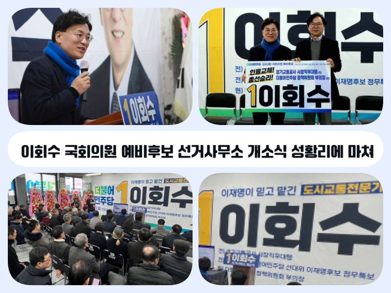 오는 4월 10일 치러질 제22대 총선에서 김포을 지역구에 출마를 선언한 이회수 (전 경기교더불어민주당 정책위원회 부위원장) 예비후보가 26일 오후 3시 김포시 구래동에 위치한 이회수 선거사무소(김포한강4로 530, 우승프라자)에서 선거사무소 개소식을 열고 필승의 각오를 다졌다.