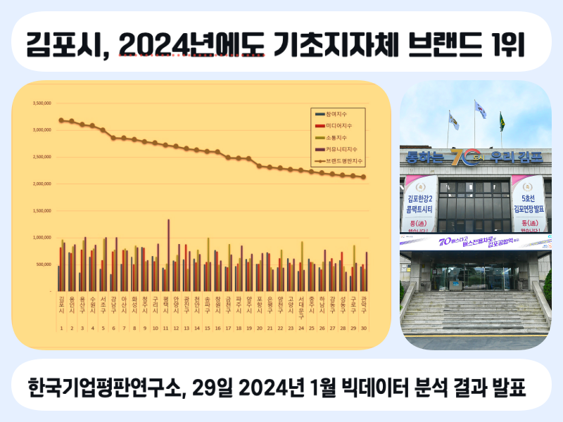 한국기업평판연구소는 대한민국 기초자치단체 226개 브랜드에 대해 2023년 12월 29일부터 2024년 1월 29일까지 도시 브랜드 빅데이터 328,410,482개를 분석한 결과, 1위 김포시 2위 용인시 3위 용산구 순으로 분석됐다고 29일 밝혔다.