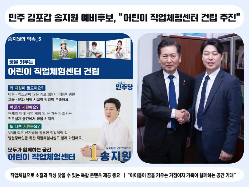 더불어민주당 김포갑 송지원 국회의원 예비후보가 25일, 자신의 5번째 공약으로 김포시에 어린이 직업체험센터 건립을 추진하겠다고 밝혔다.