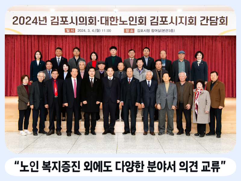 김포시의회(의장 김인수, 이하 시의회)가 4일 김포시청 참여실에서 대한노인회 김포시지회(이하 노인회)와 정담회를 열었다.