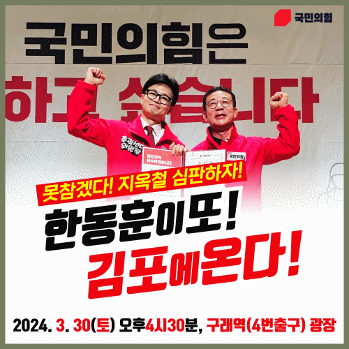 국민의힘 김포(을) 홍철호 국회의원 후보는 오는 30일(토) 오후 4시 30분, 구래역(4번출구) 광장에서 "한동훈 총괄비상대책위원장과 합동 연설회를 갖는다"고 밝혔다.