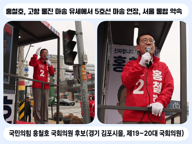 국민의힘 홍철호 국회의원 후보(경기 김포시을, 제19~20대 국회의원)가 3일 고향인 통진읍 마송리 유세에서 22대 총선 대표 공약인 서울지하철 5호선 마송 연장과 서울 통합을 반드시 실현시키겠다고 약속했다. 홍철호 후보는 유세에서 “정부에 5호선이 통진(마송)역까지 연장될 수 있도록 건의했고, 현재 국토부가 5호선 통진(마송) 추가 연장에 대한 제안을 접수했다”며, “마송 주민 뜻에 따라 5호선 ‘마송역’이 들어설 수 있도록 하겠다”고 밝혔다.