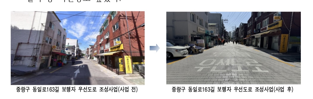 중랑구는 동일로163길 일대(장미꽃빛거리)는 상권 이용과 보행 시 편의를 누릴 수 있도록 디자인 포장과 보행자 우선도로 지정을 완료했다. 상가 밀집 지역인 특성을 고려해 방문자들의 안전을 우선했으며, 특히 노후화된 상당수의 보도 상황을 개선했다.