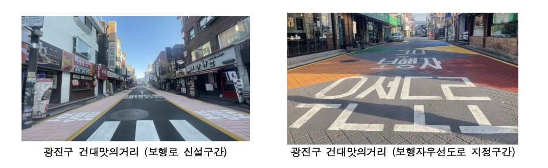 광진구는 지역 내 주요 상권인 건대맛의거리 구간의 보행환경을 증진했다. 대학생, 상권 방문객, 지역 주민을 위해 도로 양쪽에 보행로를 신규 설치했고, 차량과 보행자가 뒤섞여 복잡한 공간이었던 도로는 일방통행로· 보행자 우선도로로 지정해 원활한 통행이 이뤄지도록 했다.