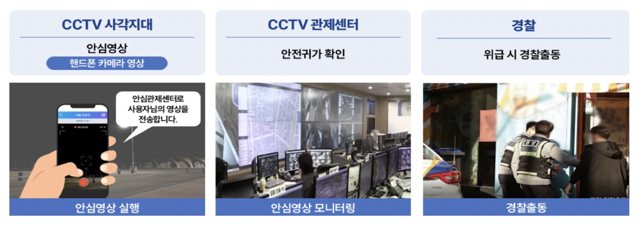 ‘안심영상 서비스’를 실행하면 자동으로 스마트폰 플래시가 켜지며 촬영이 시작되며, 주변에 CCTV가 있는 곳에서는 사용자 주변 CCTV 3개에 추가로 스마트폰 영상까지 동시에 모니터링해서 보다 촘촘한 관제가 가능해진다.