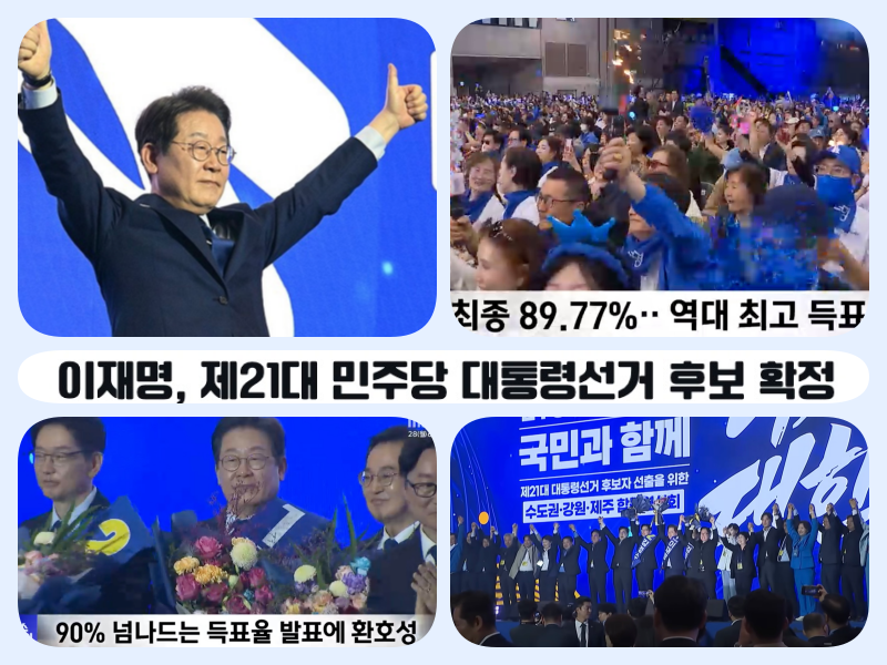 이 후보는 당원 투표 90.32%, 일반 국민 여론조사 89.21%를 기록하며 전체 합산 89.77%의 압도적인 득표율로 후보에 올랐다. 이는 민주당 역대 경선 중 최고 수준의 수치로, 이른바 ‘이재명 대세론’을 굳히는 계기가 됐다.
