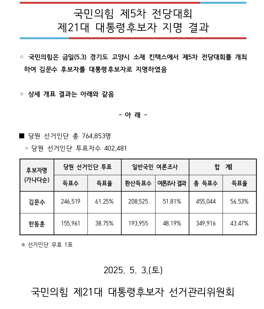 국민의힘 제5차 전당대회 제21대 대통령후보자 지명 결과 |