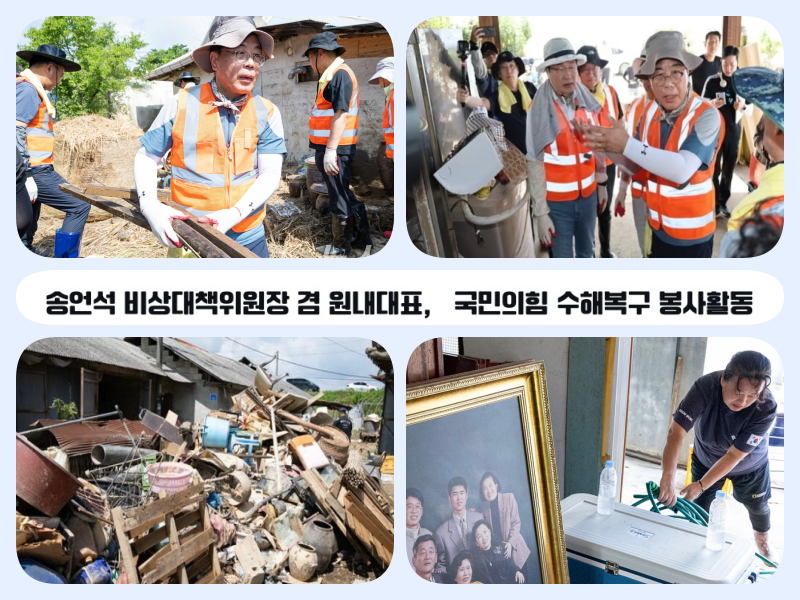조속히 수재를 입은 분들이 용기를 되찾고, 일상으로 되돌아갈 수 있도록 우리 국민의힘에서는 국민과 함께 성원하고 계속 지원 활동을 벌이도록 하겠다.