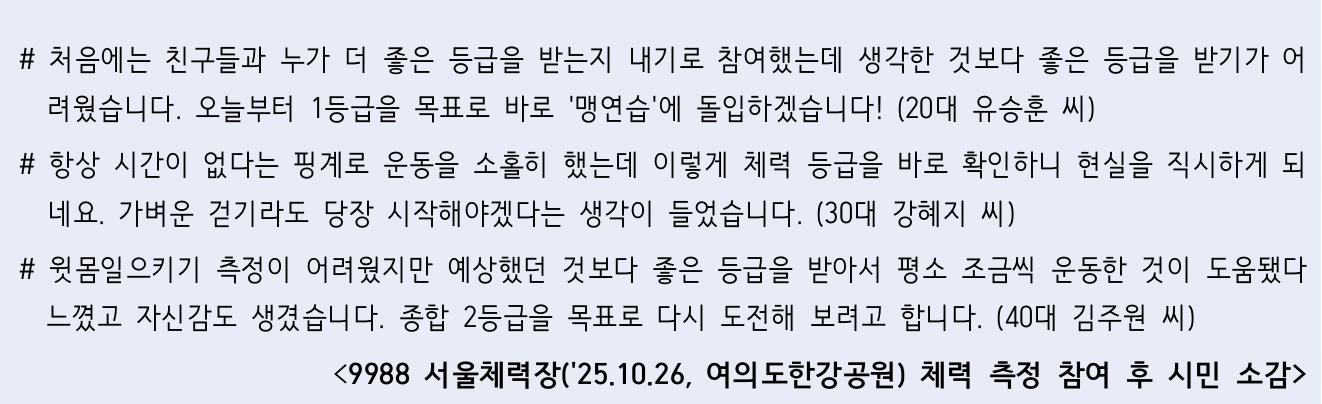 - 서울시립대학교, 광진‧도봉구에 서울체력9988 체력인증센터… 내년까지 50개로 확대 - 만 19세 이상 시민 사전 예약 후 체력 측정, 운동처방‧보건소 건강서비스 원스톱 연계 - 시 “더 건강한 서울 9988-3‧3‧3‧3 실현을 위해 시민 종합 건강관리 지원해 나갈 것” |