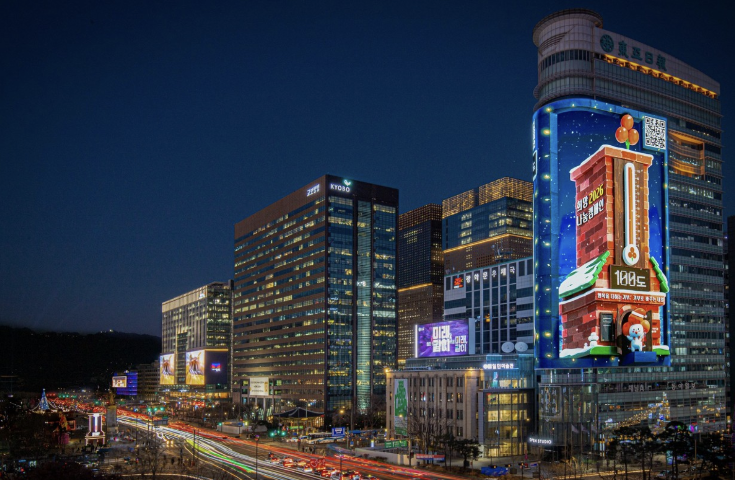 서울시청 방향의 평면 전광판에는 사랑의온도탑 디자인과 브랜드 캐릭터 ‘열매둥이’를 모션 그래픽으로 구현해 주목도를 높였다. 광화문광장 방향의 곡면 전광판은 전광판의 곡률을 활용해 ‘온도계의 수은주’가 서서히 차오르는 모습으로 표현했다. 하나의 콘텐츠를 보더라도 위치와 시점에 따라 다른 장면과 메시지가 드러나도록 설계해 시민들에게 색다른 시각적 경험을 제공한다.