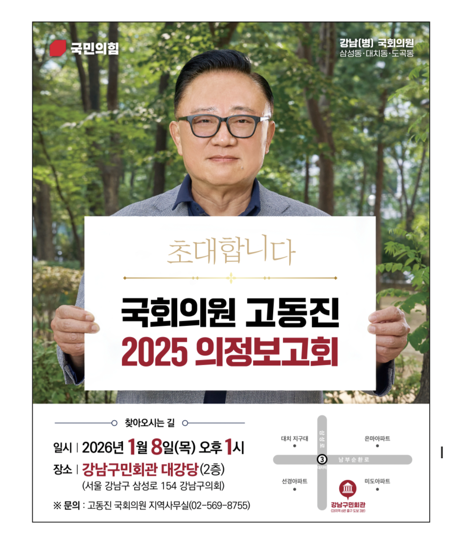 국회 행정안전위원회 소속 고동진 국회의원(국민의힘, 서울 강남구병)은 오는 8일(목) 오후 1시, 강남구민회관 2층 대강당에서 「2025 의정보고회」를 개최한다고 밝혔다.