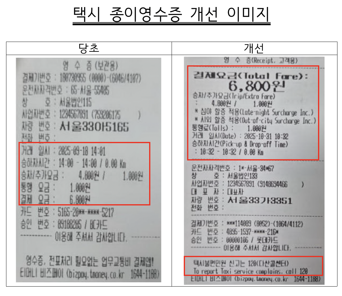 □ 이에 따라 지난달부터 시는 택시결제기 운영사인 ㈜티머니모빌리티와 협력해 영수증에 ▴최종 요금 ▴승하차시간 등 중요사항을 영문으로 병행 표기하고 ▴심야․시계외 할증 여부와 함께 영수증 하단에 ▴택시 불편신고(☎120다산콜센터)를 안내하고 있다.