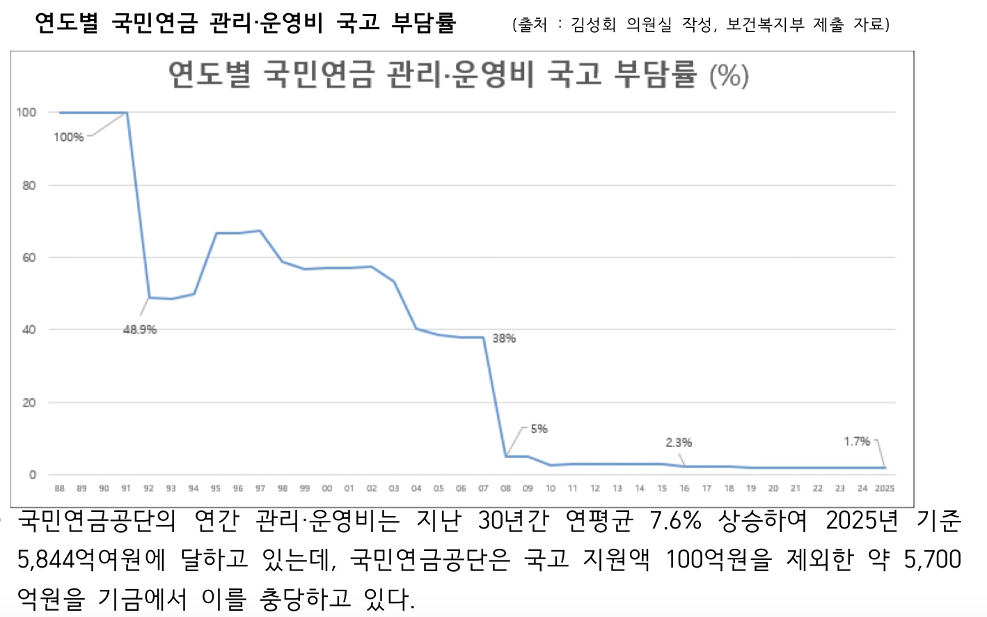 국민연금공단의 연간 관리·운영비는 지난 30년간 연평균 7.6% 상승하여 2025년 기준 5,844억여원에 달하고 있는데, 국민연금공단은 국고 지원액 100억원을 제외한 약 5,700억원을 기금에서 이를 충당하고 있다.