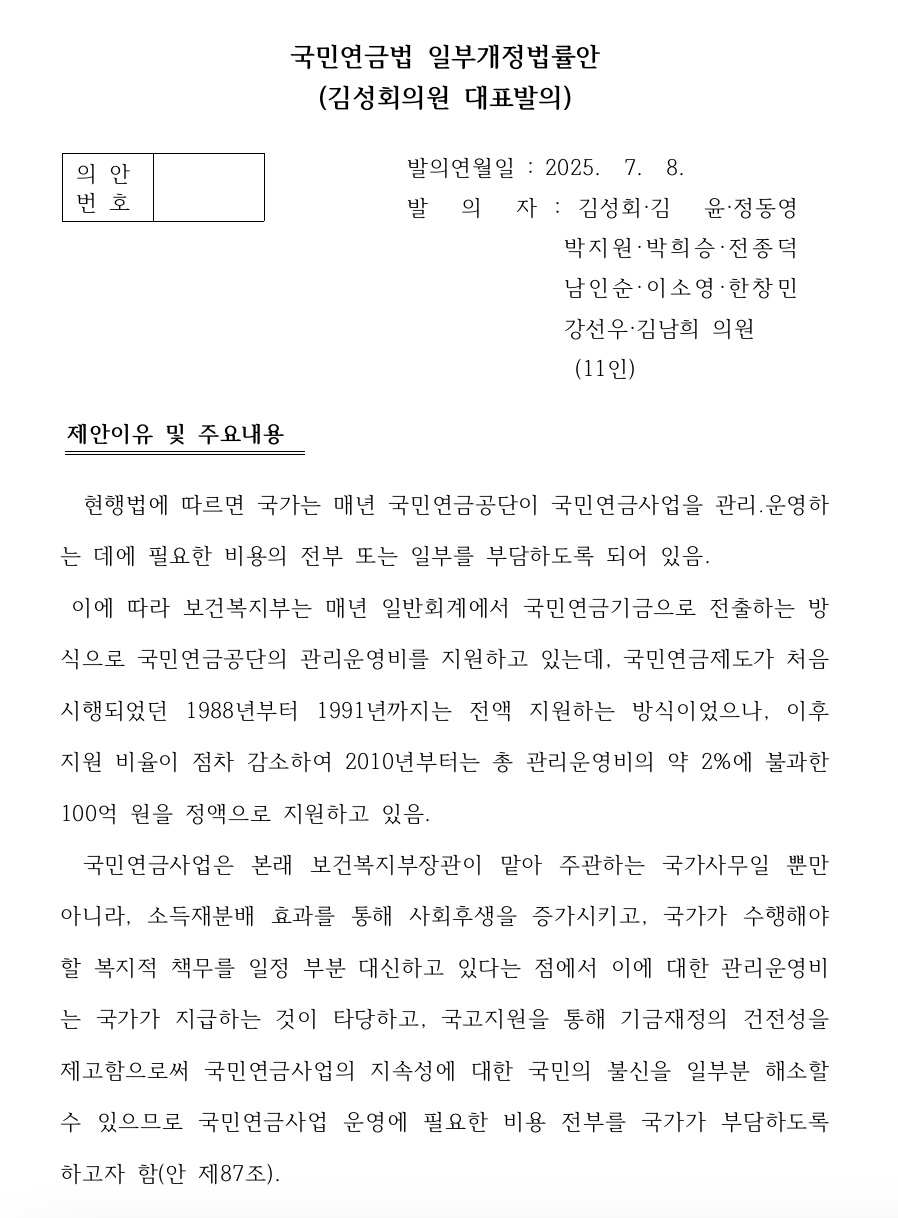 이에 해당 개정안은 국민연금공단이 수행하는 연금사업의 관리·운영에 필요한 비용을 전액 국가가 부담하도록 명시함으로써, 국민연금기금의 재정건전성을 제고하고 제도의 지속가능성에 대한 국민 불신을 해소하고자 했다.