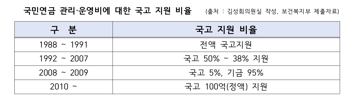 김성회 의원은 이에 대해 “국가가 마땅히 수행해야 할 복지책무를 국민연금이 대신하고 있는데, 그 운영비조차 기금에서 자체 충당하라는 것은 명백한 책임 회피일 뿐 아니라, 국민들의 연금 부담을 가중시키는 일”이라고 지적했다.