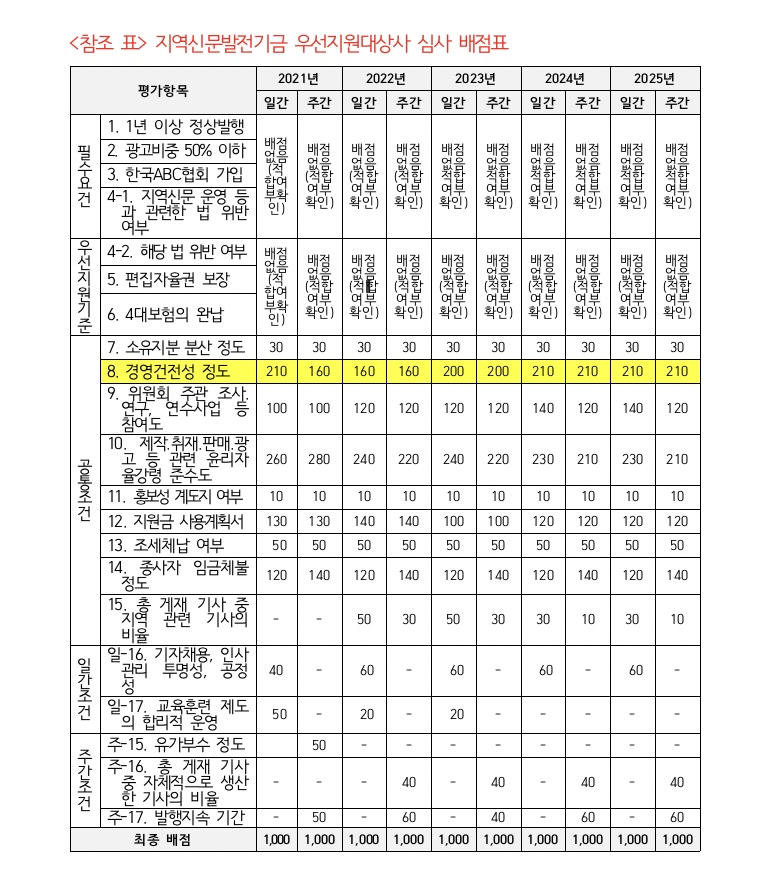국회 문화체육관광위원회 박수현 의원(더불어민주당 / 충남 공주·부여·청양)이 20일 한국언론진흥재단(이하 재단)으로부터 제출받은 ‘재단 기금사업 지역언론 지원 현황’자료에 따르면, 지역신문을 지원하기 위해 설립된 ‘지역신문발전기금’ 지원대상이 2025년 기준 67개사에 불과한 것으로 드러났다. 해당 기금의 지원 대상이 되려면 먼저 ‘우선지원대상사’로 선정되어야 하는데 2025년에는‘지역신문’ 94개사가 신청해서 67개사가 선정되었고, 2024년에는 98개 중 68개 2023년은 99개 중 82개, 2022년은 104개 중 78개, 2021년은 101개 중 77개사 등이다. 신청대비 선정비율을 보면 2025년 기준 71%(94개중 67개사)이지만, 전체 ‘지역신문’ 숫자가 2025년 994개사인 것을 감안하면 선정비율이 6.7%에 불과한 실정이다.“‘우선지원대상사’에 선정되기 위해서는 경영건전성, 4대보험완납 등 17개 평가항목을 통과해야 하는데, 이러한 요건상의 어려움으로 상당수의 지역언론이 신청조차 포기했다”는 것이 박수현 의원의 분석이다. <참조>