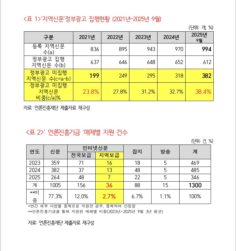‘정부광고’ 배정에서도 ‘지역언론’의 어려움이 드러난다. 재단 제출자료에 따르면, 2025년 9월 기준 전체 994개 지역언론중 정부광고를 한건도 받지 못한 ‘지역신문’이 382개사, 비중으로는 38.4%에 달한다. 연도별로 보면 2021년 199개사 23.8%, 2022년 249개사 27.8%, 2023년 295개사 31.2%, 2024년 318개사 32.7%로 해마다 정부광고를 한건도 받지 못한 ‘지역신문’의 비중과 숫자가 증가하고 있다.<표 1>