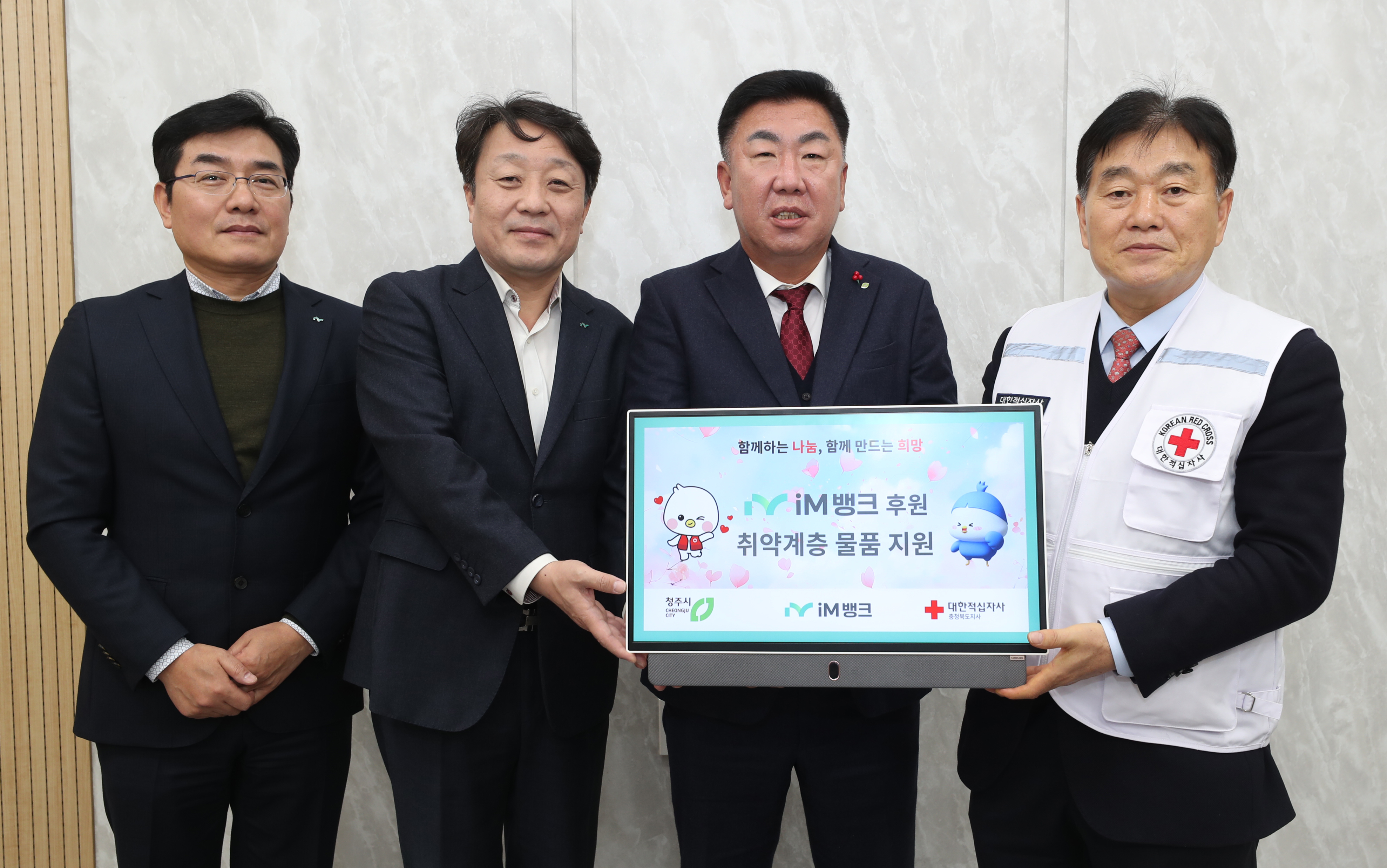 임시청사 직지실에서 진행된 기탁식에는 이범석 청주시장, 김기만 iM뱅크 부행장, 장현봉 대한적십자사 충북지사 회장이 참석했다.
