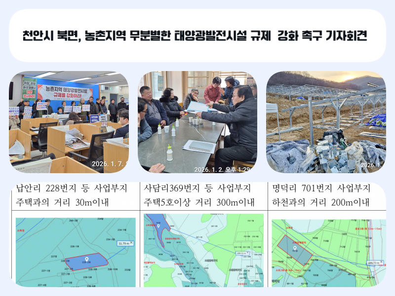 한편, 주민들은 “합법적이고 계획적인 태양광 설치는 환영하지만, 편법과 특혜로 추진되는 개발은 결코 받아들일 수 없다”며 “오늘의 행정 판단이 납안리 한 마을의 문제가 아니라, 앞으로 천안시 전역에서 반복될 개발 행정의 기준이 될 것”이라고 강조했다.