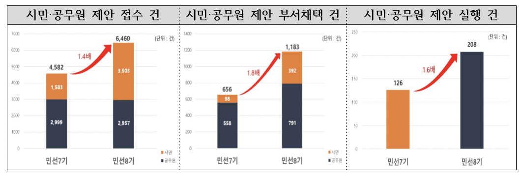 부서채택 제안은 민선 7기 656건에서 민선 8기 1,183건으로 늘었고, 실행 건수 역시 126건에서 208건으로 1.6배 이상 확대됐다.