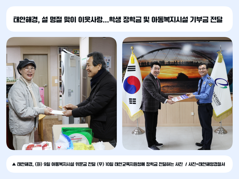 태안해양경찰서(서장 김진영)는 설 명절을 맞이하여 아동복지시설과 태안교육지원청에 위문금 및 장학금 350만원을 전달했다고 10일 밝혔다.