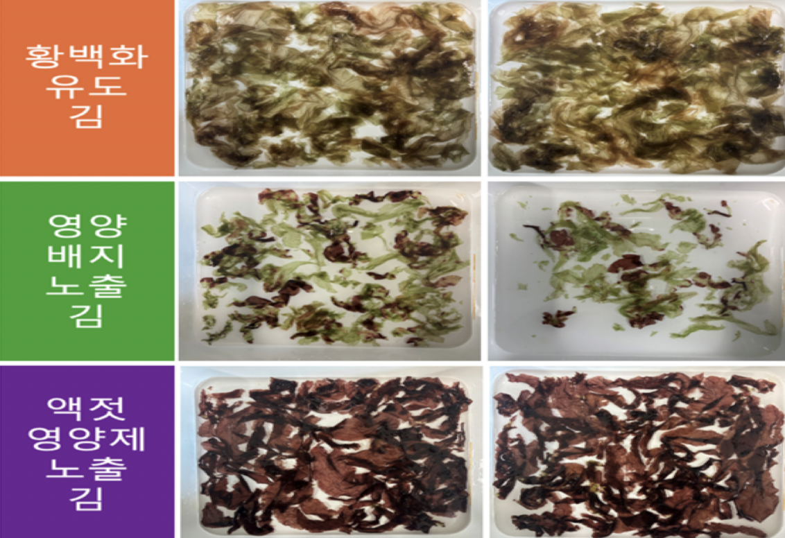실내 실험에서는 동일한 황백화 김을 3개 군으로 나눠 △일반 해수 △영양염 배지를 첨가한 해수 △액젓 찌꺼기 치료제를 투입한 해수에 넣어 비교 관찰했다.