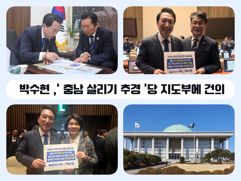 박수현 충남도지사 경선 후보(더불어민주당 국회의원, 충남 공주·부여·청양)는 2일 이재명 정부의 2026년도 추가 경정예산 편성과 관련해 ‘추경 3대 핵심사업 반영 건의서’를 더불어민주당 정청래 당대표, 한병도 원내대표, 한정애 정책위의장, 진성준 국회 예결위원장 및 이소영 간사, 김민석 국무총리 등에게 제출했다. 주요 내용은▴석유·화학산업 위기극복 ▴AX 산업혁신 ▴문화를 통한 야간경제(Night Time Economy) 활성화를 위한 사업들이다.