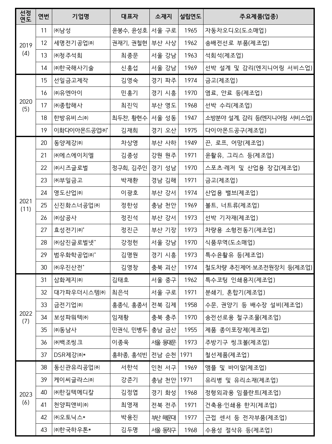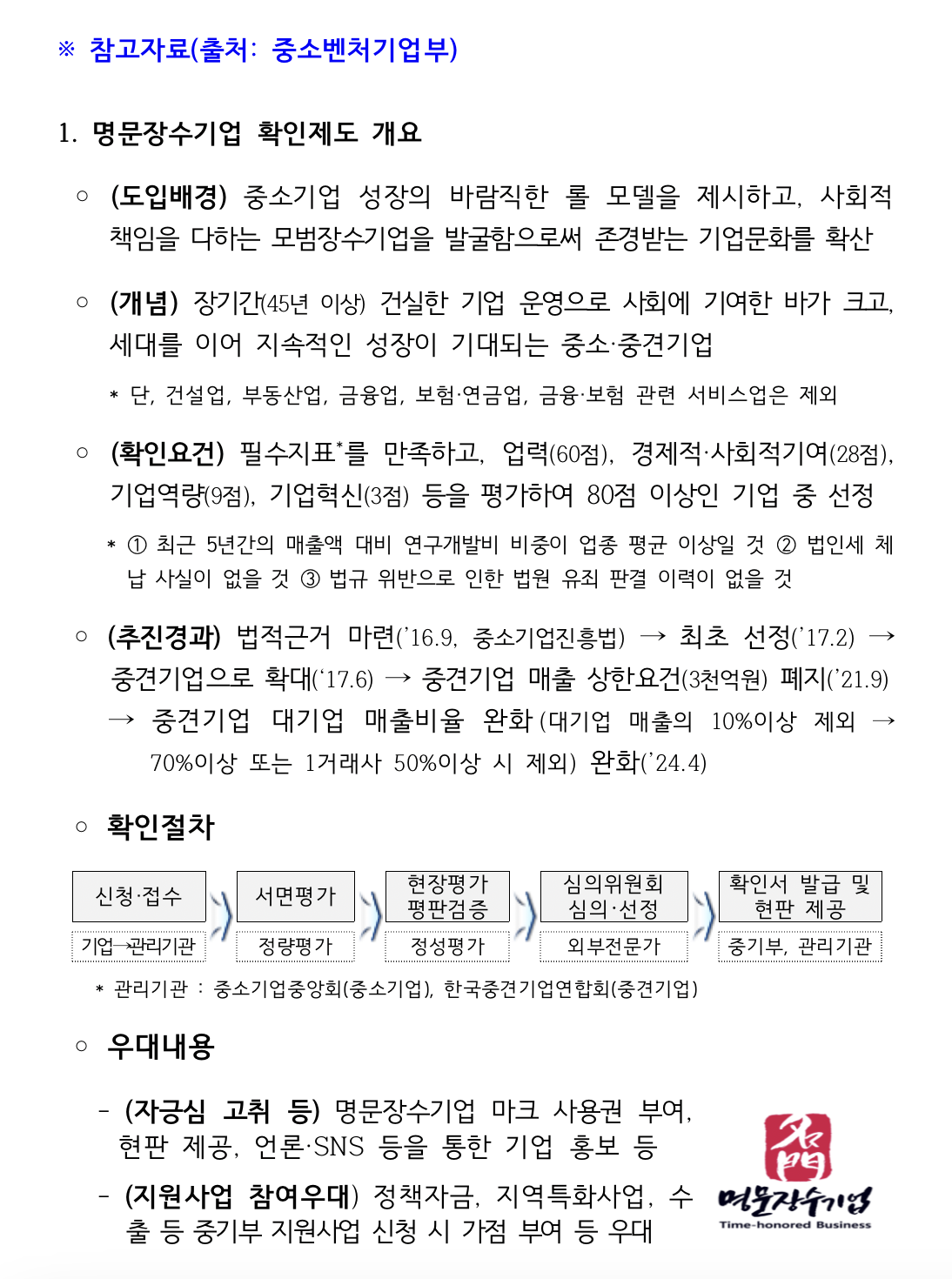 명문장수기업은 장기간(45년 이상) 건실한 기업 운영으로 경제·사회적 기여도가 높고 세대를 이어 지속적인 성장이 기대되는 중소·중견기업을 선정해 홍보 및 포상하는 제도다. 2016년 도입되어 현재까지 총 53개사가 선정됐다.