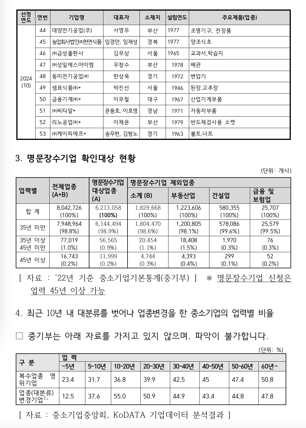 문제는 현행법에서 건설업, 부동산업, 금융업, 보험 및 연금업 등을 명문장수기업 대상에서 제외하고 있다는 점이다. 최근 콘테크(건설업), 프롭테크·공유오피스(부동산업), 핀테크(금융업), 인슈어테크(보험업) 등 최신 기술을 접목한 신산업이 창출되면서 이들 업종에서도 사회적·경제적 기여가 큰 명문장수기업을 선정해야 한다는 의견이 제기되고 있다.