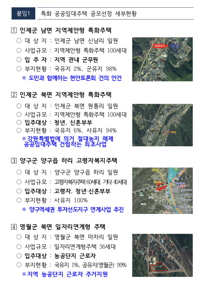「특화 공공임대주택 건립사업」 은 ① 지역제안형 특화주택, ②고령자복지주택, ③ 일자리연계형 지원주택, ④ 청년특화주택으로 나뉘어 진행되었다. 이번 공모에서 인제군(남면·북면)은 지역제안형 특화주택, 양구군은 고령자복지주택, 영월군은 일자리 연계형 주택으로 각각 선정되었다.