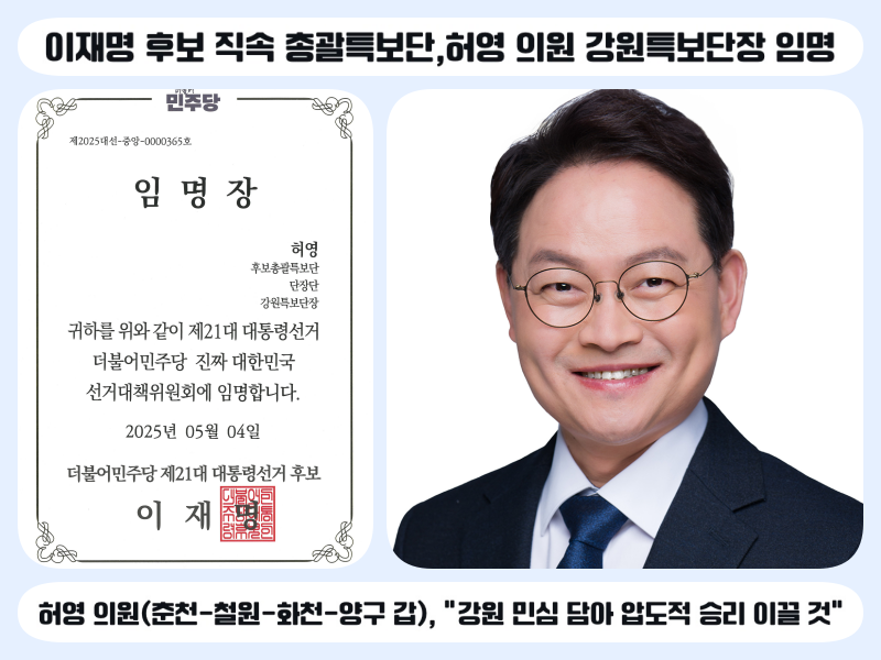 이재명 후보 직속 총괄특보단,허영 의원 강원특보단장 임명 |