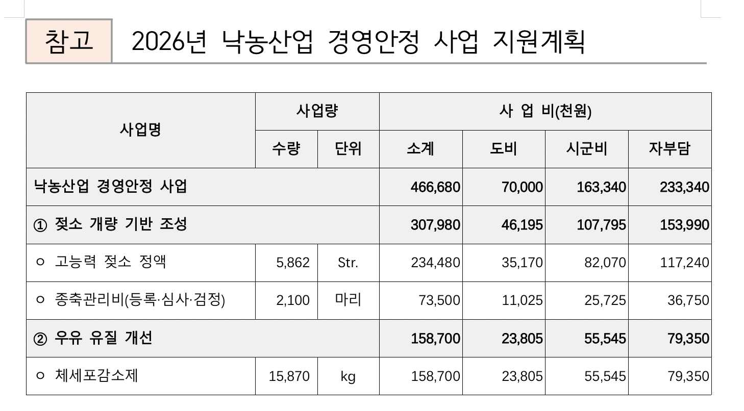 ① 젖소 개량 기반 고품질 우유 생산 확대 및 축산농업인 경영 안정화 ② 고능력 정액, 젖소등록‧심사‧검정, 체세포감소제 등 3개 분야 5억 원 투입 |
