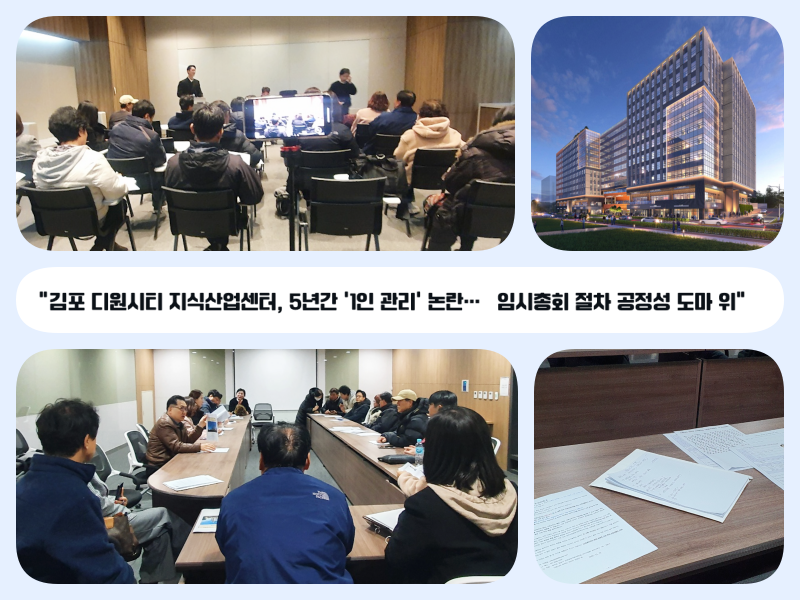 김포시 디원시티 지식산업센터에서 약 5년간 관리위원회 없이 관리인 1인 체제가 유지돼 온 사실이 드러났다. 지난 12월 8일(월) 디원시티에서 오전 11시에 진행된 임시총회의 절차적 공정성을 둘러싸고 구분 소유자들의 반발이 이어지고 있다.