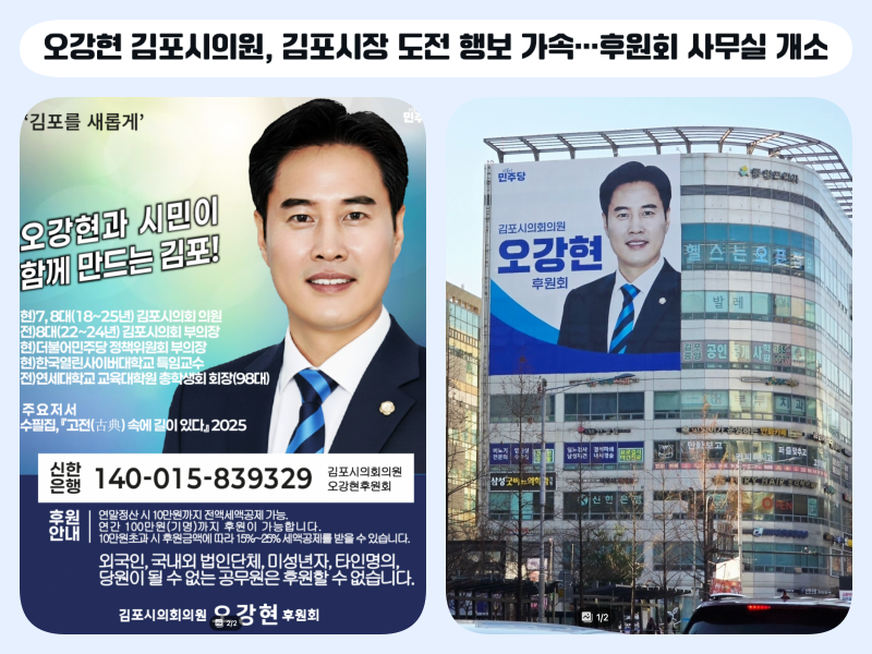 2026년 6월 3일 치러지는 민선9기 지방선거를 앞두고 김포시장 선거 구도가 서서히 윤곽을 드러내는 가운데, 더불어민주당 오강현 김포시의원이 후원회 사무실을 개소하며 시장 도전을 위한 행보에 속도를 내고 있다.