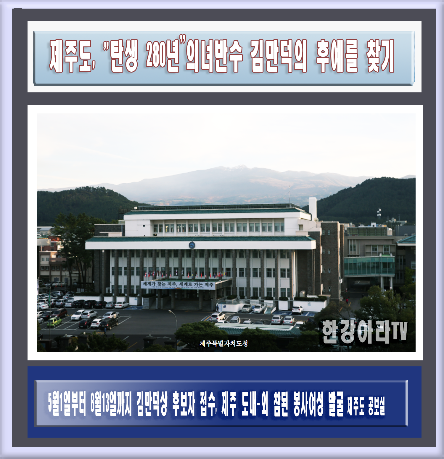 시상은 2018년 김만덕 주간 행사인 만덕제 봉행 시(10월21일 예정) 이뤄질 예정으로 수상자에게는 상패와 시상금(각 500만원)이 수여된다.