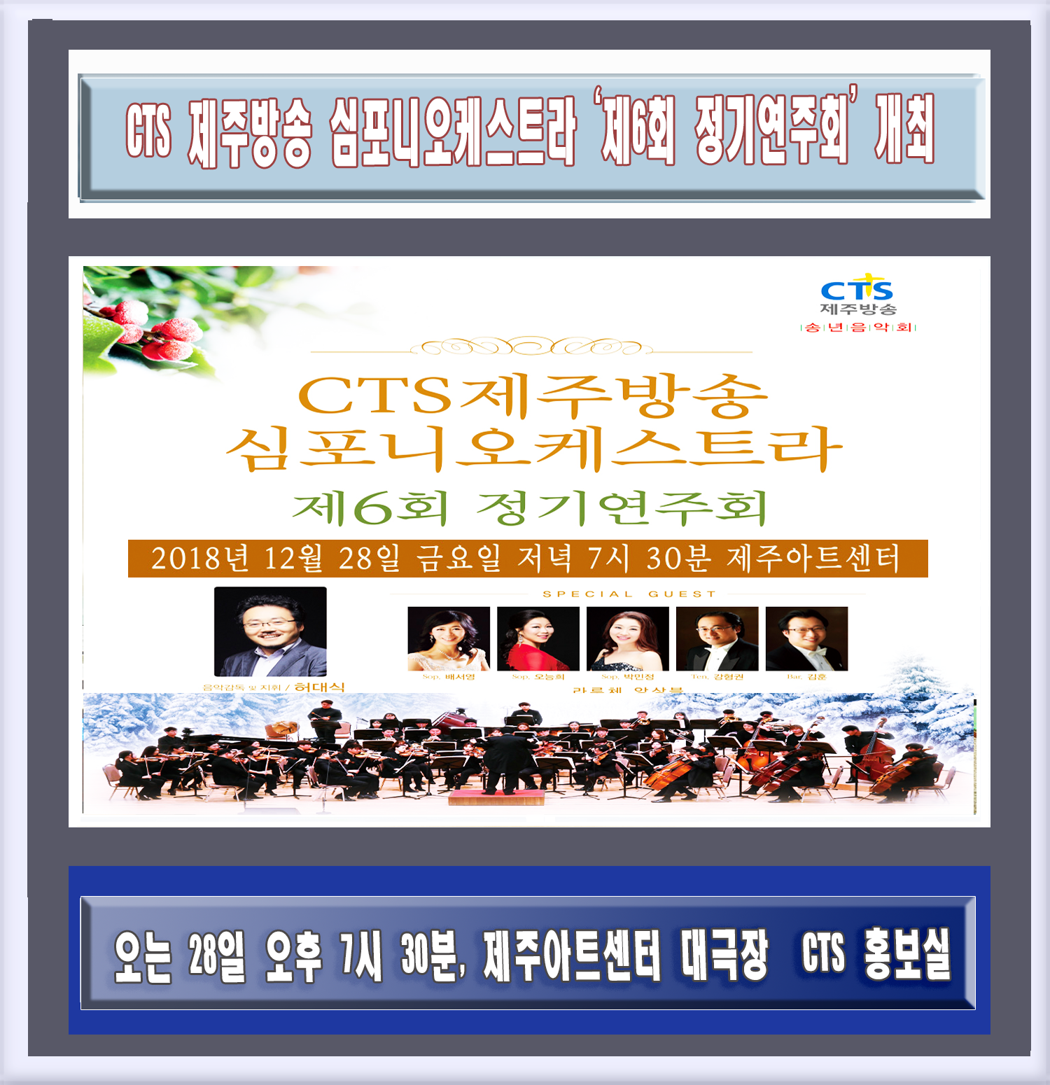 CTS제주방송(지사장 오동환) 전속 심포니오케스트라(단장 홍혜자)는 오는 28일 오후 7시 30분 제주아트센터 대극장에서 제6회 정기연주회를 개최한다.