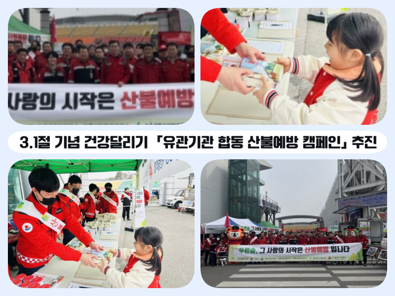 이번 캠페인은 3.1절 기념 「제26회 시민건강달리기대회」 및 「제66회 단축마라톤대회」와 연계해 진행됐으며, 행사 참가자 및 시민들을 대상으로 산불예방 홍보 활동을 펼쳤다.