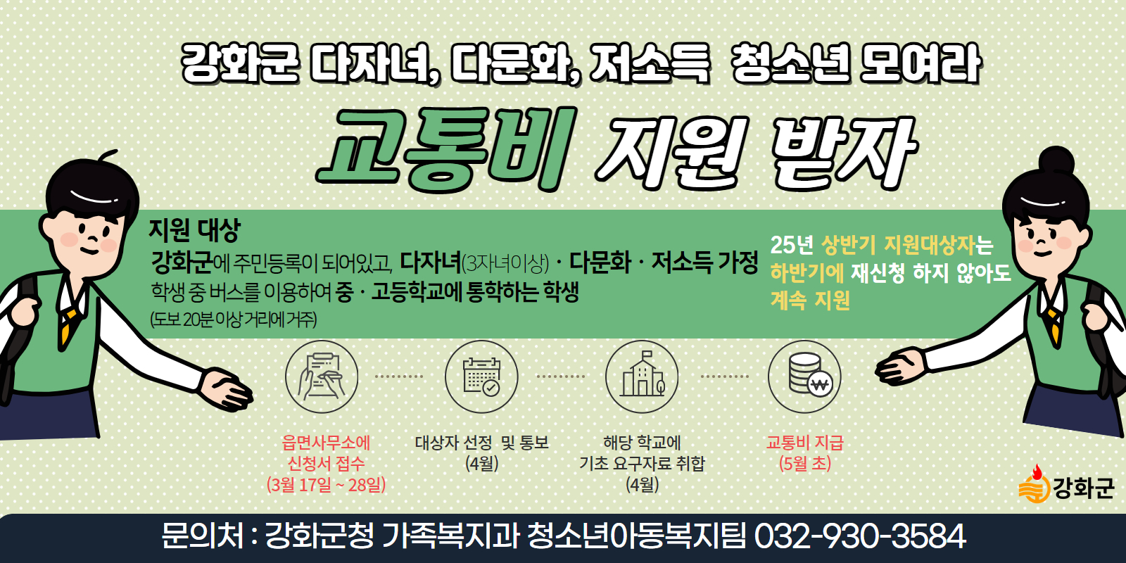 강화군(군수 박용철)은 다자녀, 다문화, 저소득가정 중․고교생을 대상으로 교통비 지원사업을 실시하고 오는 17일부터 2주간 신청을 받는다고 밝혔다.