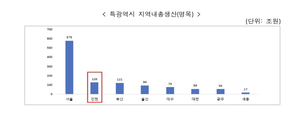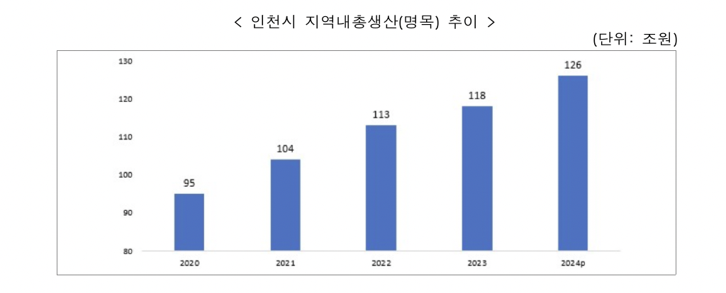 2024년 인천의 지역내총생산(GRDP)은 126조 원으로 전년 대비 8조 원 증가했다. 2021년 지역내총생산 104조 원으로 사상 처음 100조 원을 돌파한 이후, 2022년 113조 원, 2023년 118조 원에 이어 2024년에는 126조 원을 기록하며 꾸준한 성장세를 이어갔다. 이로써 인천시는 특·광역시 가운데 서울에 이어 경제규모 2위 자리를 안정적으로 유지하고 있다.