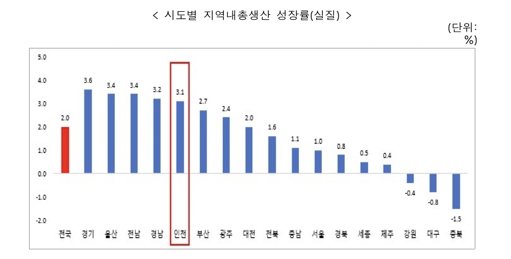 인천시, 최근 3년 평균 경제성장률 1위 달성 「2024년 지역소득(잠정)」 결과, 최근 3년 평균 성장률 5.3% 기록 |