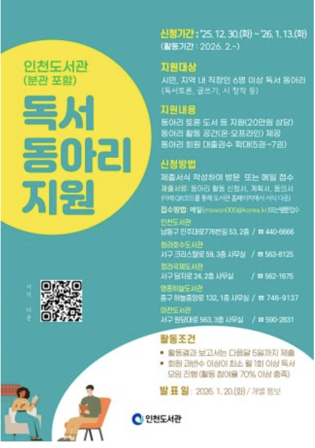 최종 선정 결과는 2026년 1월 20일에 개별 통지될 예정이며, 기타 자세한 사항은 인천도서관 누리집(도서관 소식→공지사항)에서 확인하거나 전화로 문의하면 된다.(인천도서관 대표전화 ☎ 032-440-6666)