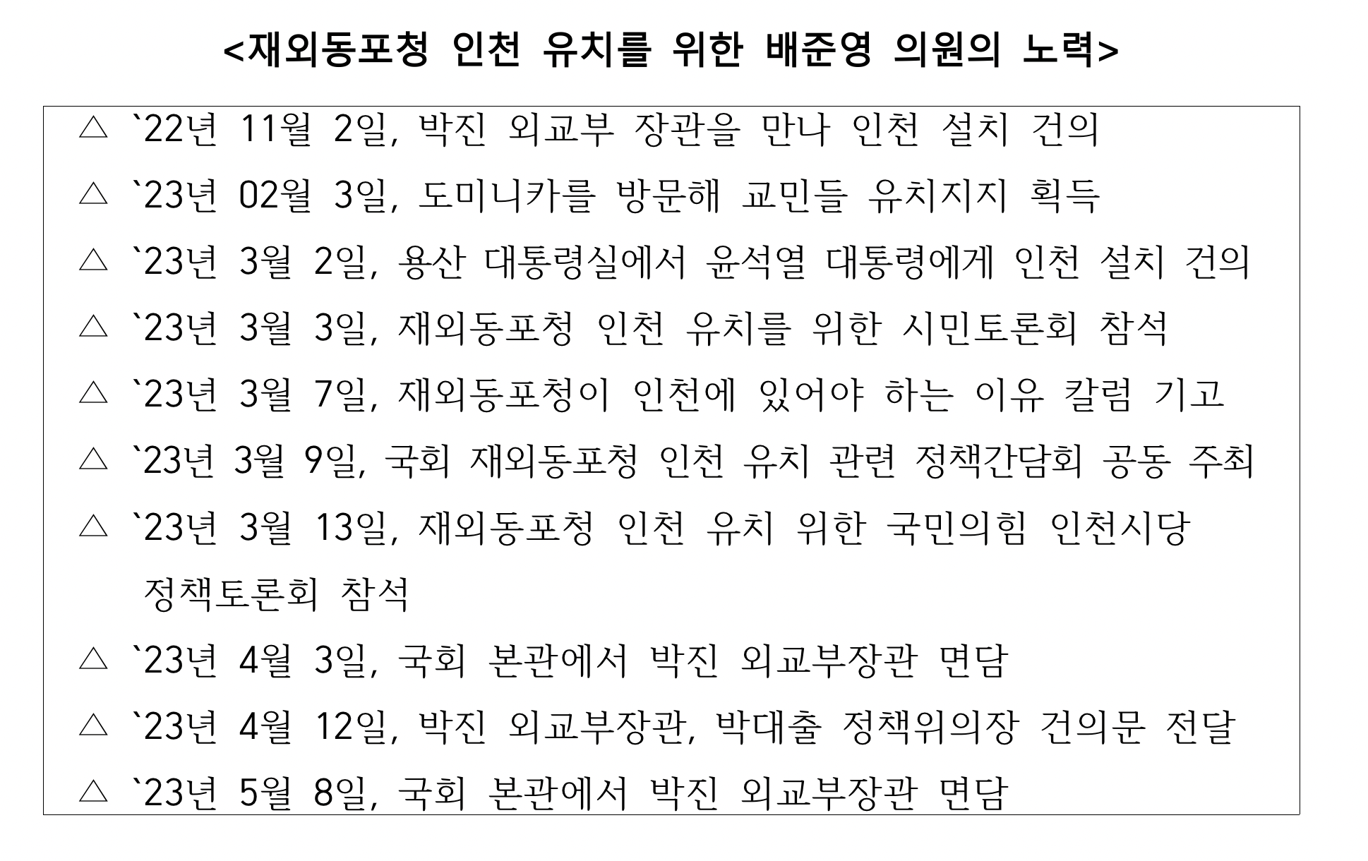 배준영 의원은 지난 2022년 11월 박진 외교부 장관을 만나 재외동포청 인천 설치를