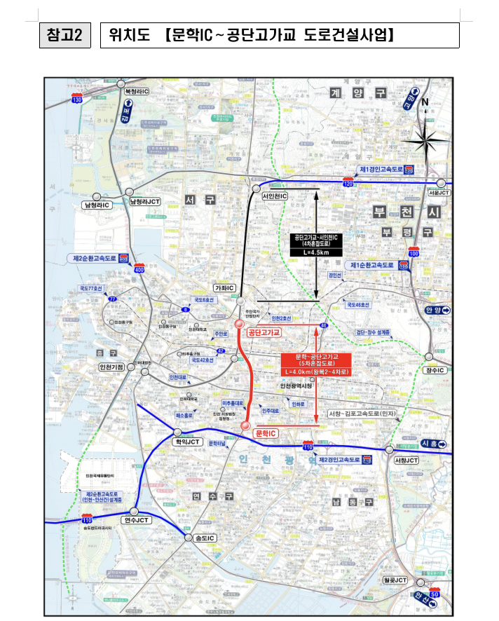 문학IC∼공단고가교 도로 건설사업은 총연장 4.0km, 왕복 4차로 규모로 추진되며, 국비 2,031억 원이 투입되어 공단고가교∼서인천IC 혼잡도로와 연계된 도심 남북축 간선도로망을 구축해 장거리 교통수요를 분산시키고 도심 내부 교통혼잡을 크게 완화할 것으로 기대된다.