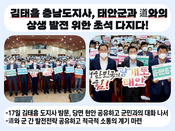 군은 민선8기 첫 시·군 방문에 나선 김태흠 충남도지사가 17일 태안군을 방문함에 따라 군청에서 공직자, 각계 인사 및 주민들과 김 지사 간 만남의 시간을 갖고 태안군과 충남도의 당면 현안을 공유하는 대화의 시간을 가졌다고 밝혔다.