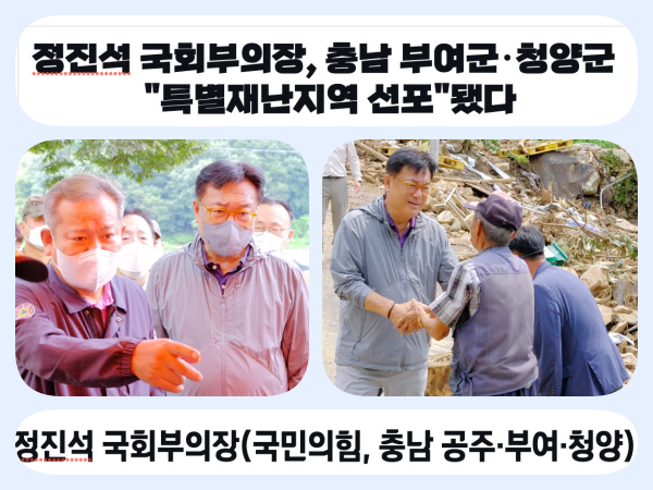 또한 지난 16일 정진석 부의장은 이상민 행정안전부 장관과 함께 부여 청양 호우 피해지역 현장을 점검하고, 이상민 장관에게 부여 청양 피해지역을 특별재난지역으로 선포해줄 것을 강력히 요청했다.