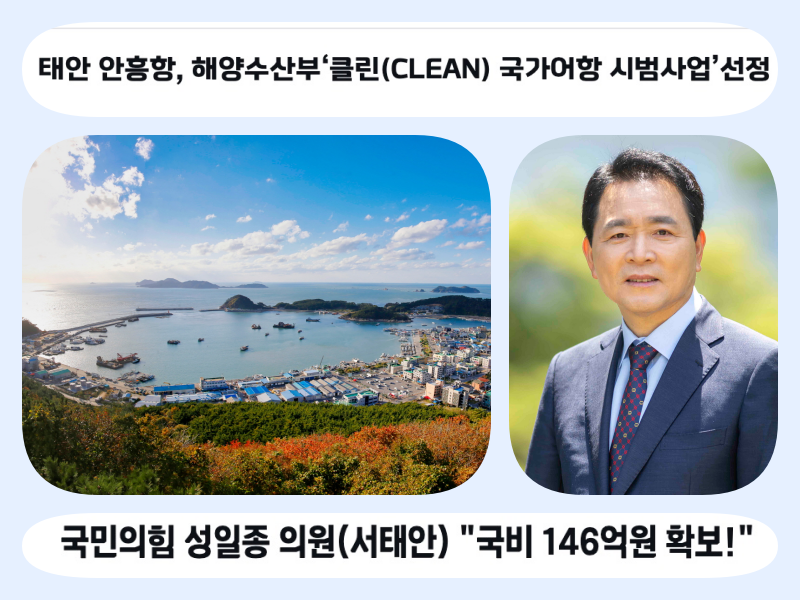 국민의힘 성일종 국회의원(충남 서산·태안)은 1일 “해양수산부의 ‘클린(CLEAN) 국가어항 시범사업’에 태안 안흥항이 최종 선정됐다”고 밝혔다.