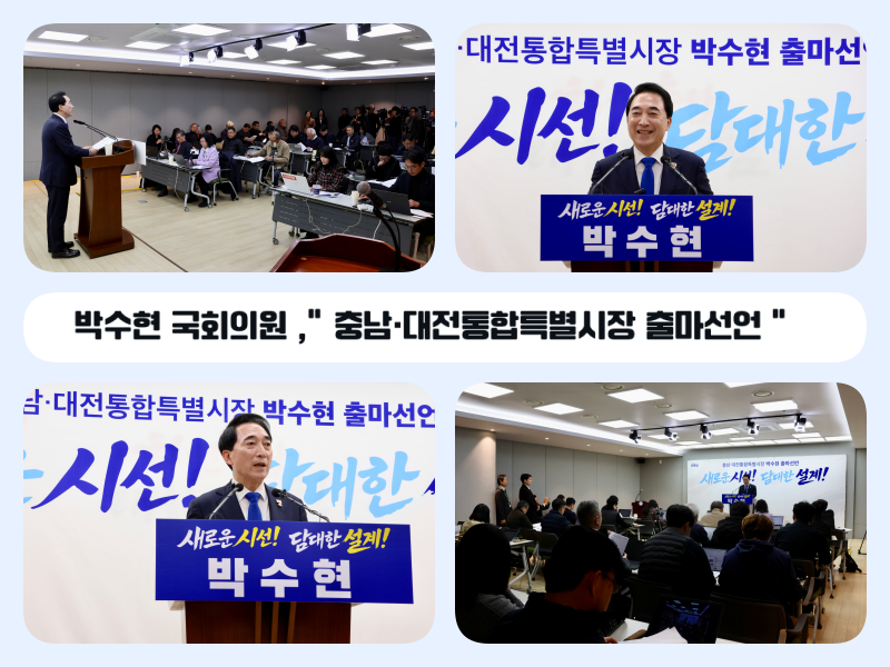 박수현 의원은 출마선언을 마무리하며“충남과 대전이 하나로 서는 순간, 대한민국의 균형발전은 비로소 현실이 된다.”라며 “충남·대전통합특별시를 대한민국 AI 대전환의 심장으로 만들겠습니다. 설계한 사람이 완성하겠습니다.”라고 강조했다.